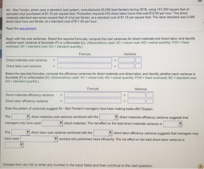 Compute the cost and efficiency variances for direct materials and direct labor. The direct materials standard was seven square feet of vinyl per. Matthews Fender which uses a standard cost system manufactured 20000 boat fenders during 2018 using 143000 square feet of extruded vinyl purchased at 130 per square foot.